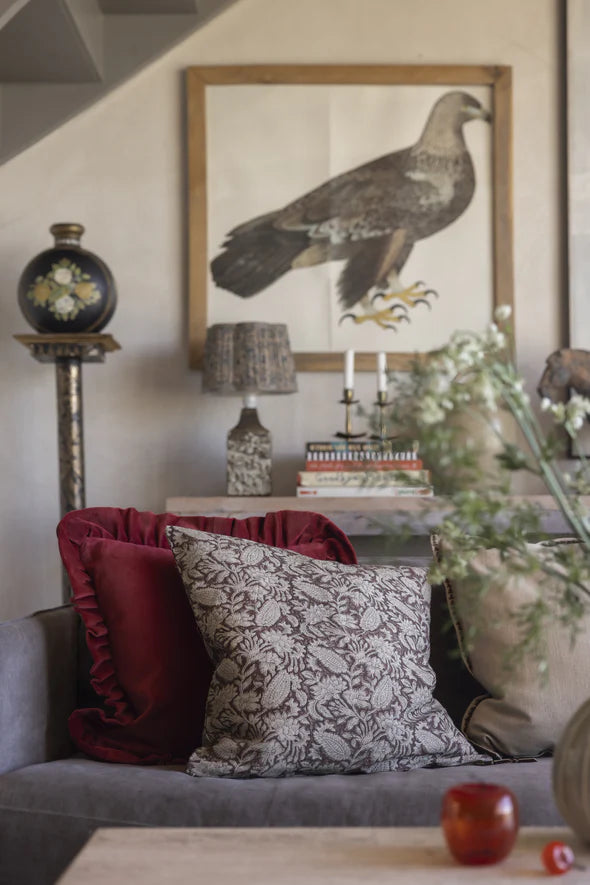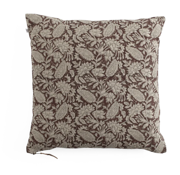 This brown Jodhpur print cushion combines quality linen with traditional woodblock printing techniques. Features a durable zipper with leather detailing for added style and functionality. Each pattern is carefully hand-printed, creating a unique decorative accent for your home. Feather insert