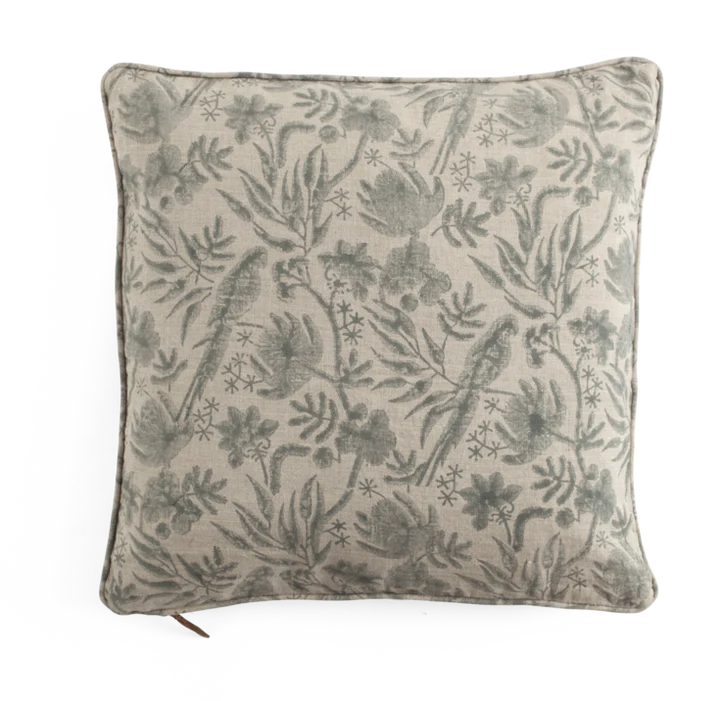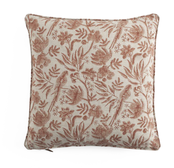 This quality linen cushion features the Parrot Open print in a rusted tone, carefully hand-printed using traditional woodblock methods. Made from premium linen for a luxurious touch, it includes a strong zipper with a small leather detail. The cushion cover combines simple elegance with skilled craftsmanship.