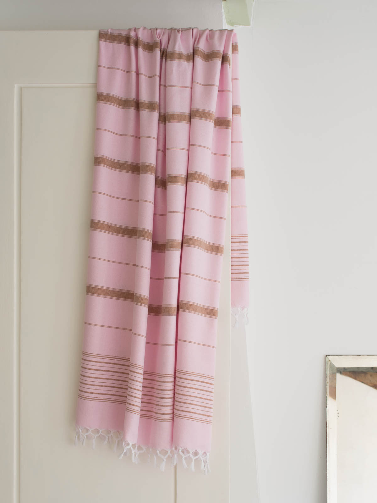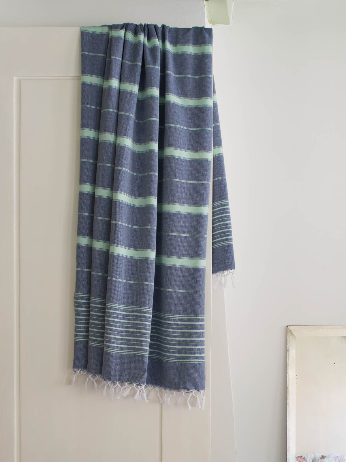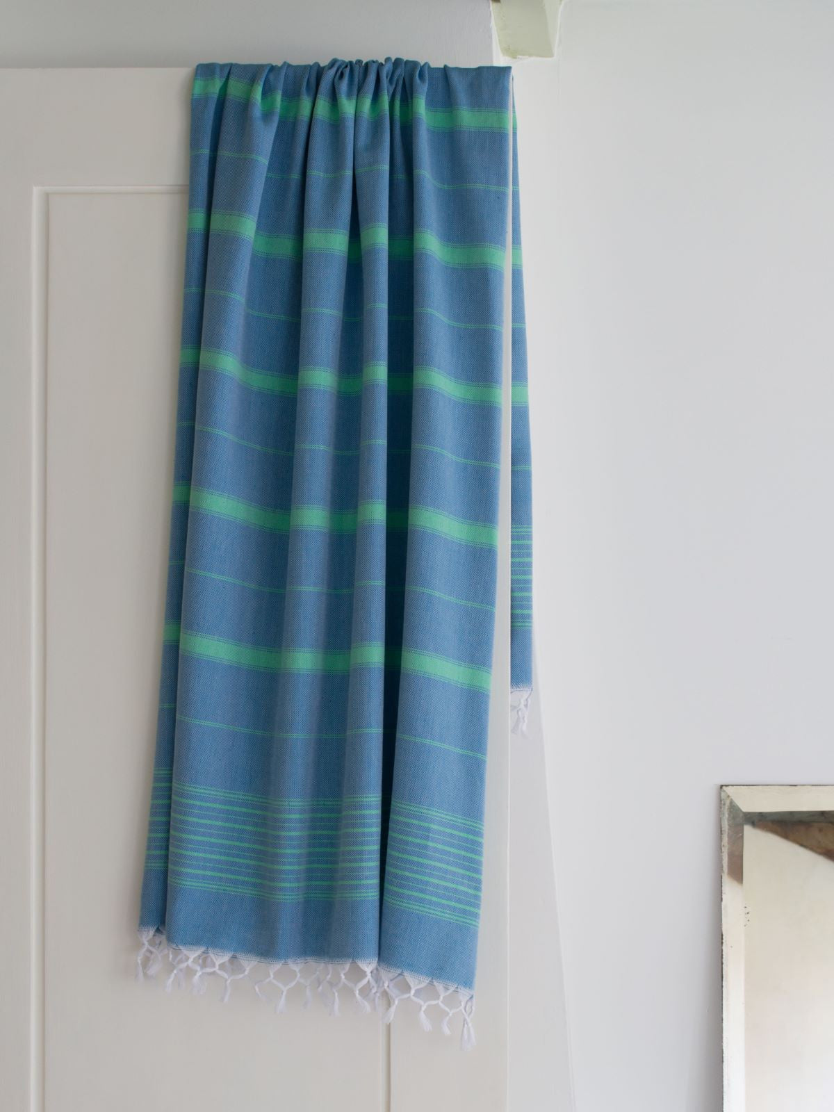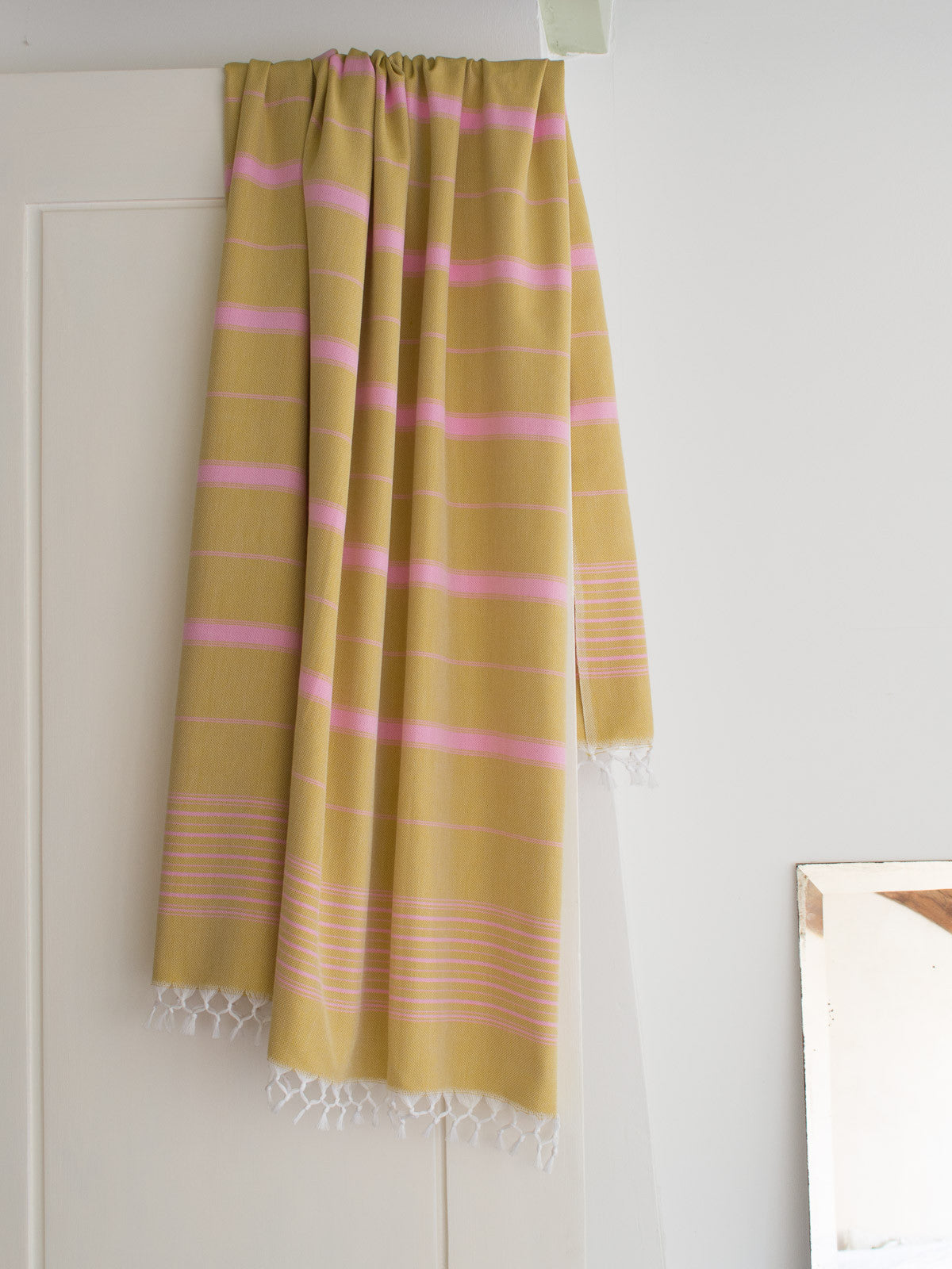 The Ege hammam towel from Ottomania is inspired by traditional cloths. Beautifully combined colors in a beautiful authentic Mediterranean stripe pattern and finished with hand-knotted fringe. A real eye-catcher!