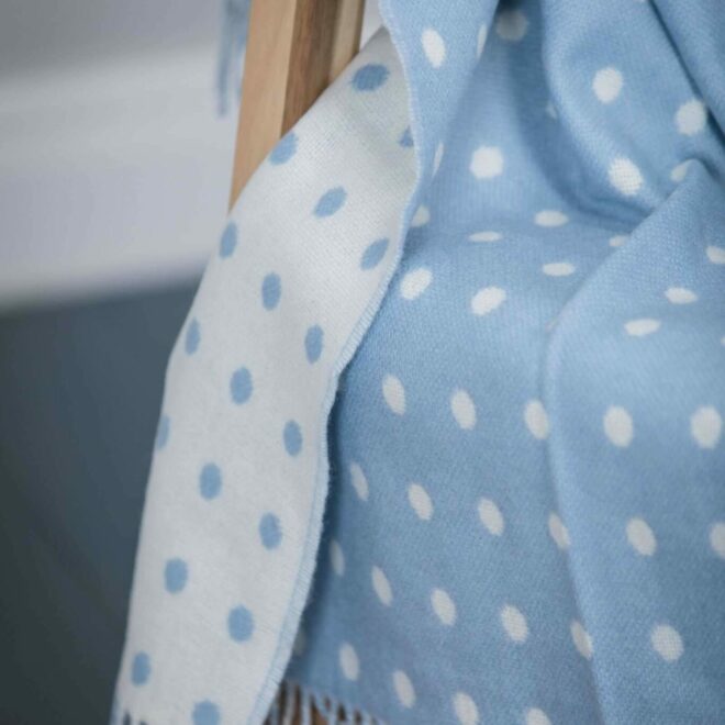 Curl up with this gorgeous soft 100% new lambswool spot design baby blanket in delicate shades of blue and white.